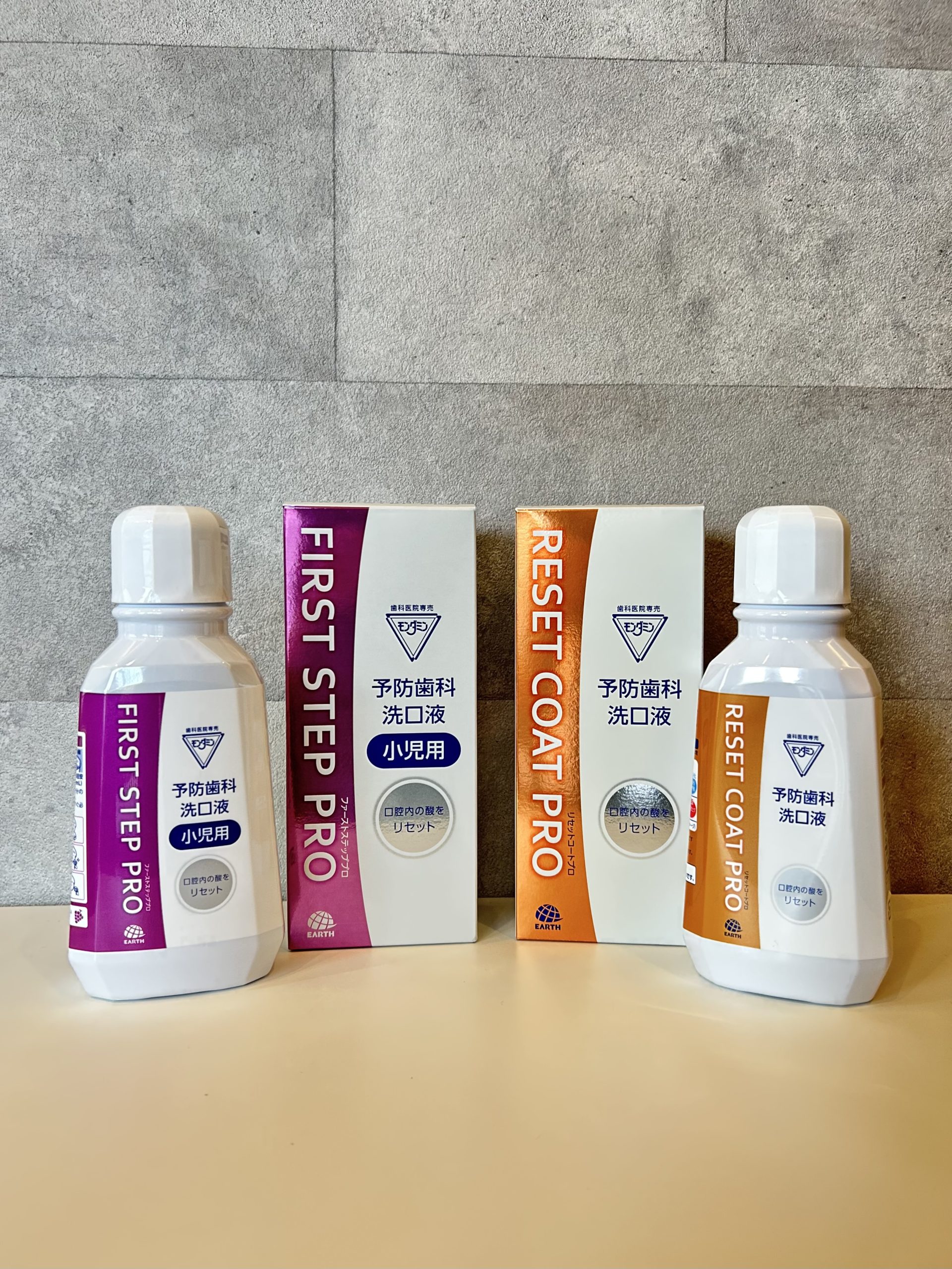今回ご紹介する洗口液『リセットコートプロ』と『ファーストステッププロ』は、食後のお口の中の酸を素早く中和してくれる効果があり、虫歯リスクが高い方向けの洗口液になっています✨